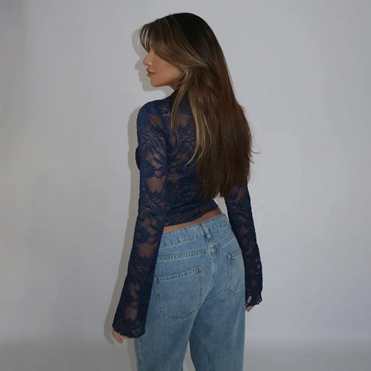 New Women's Clothing With European And American Style Sexy And Slim Fit V-Neck Lace Long Sleeved Top For Women CF24365MHO